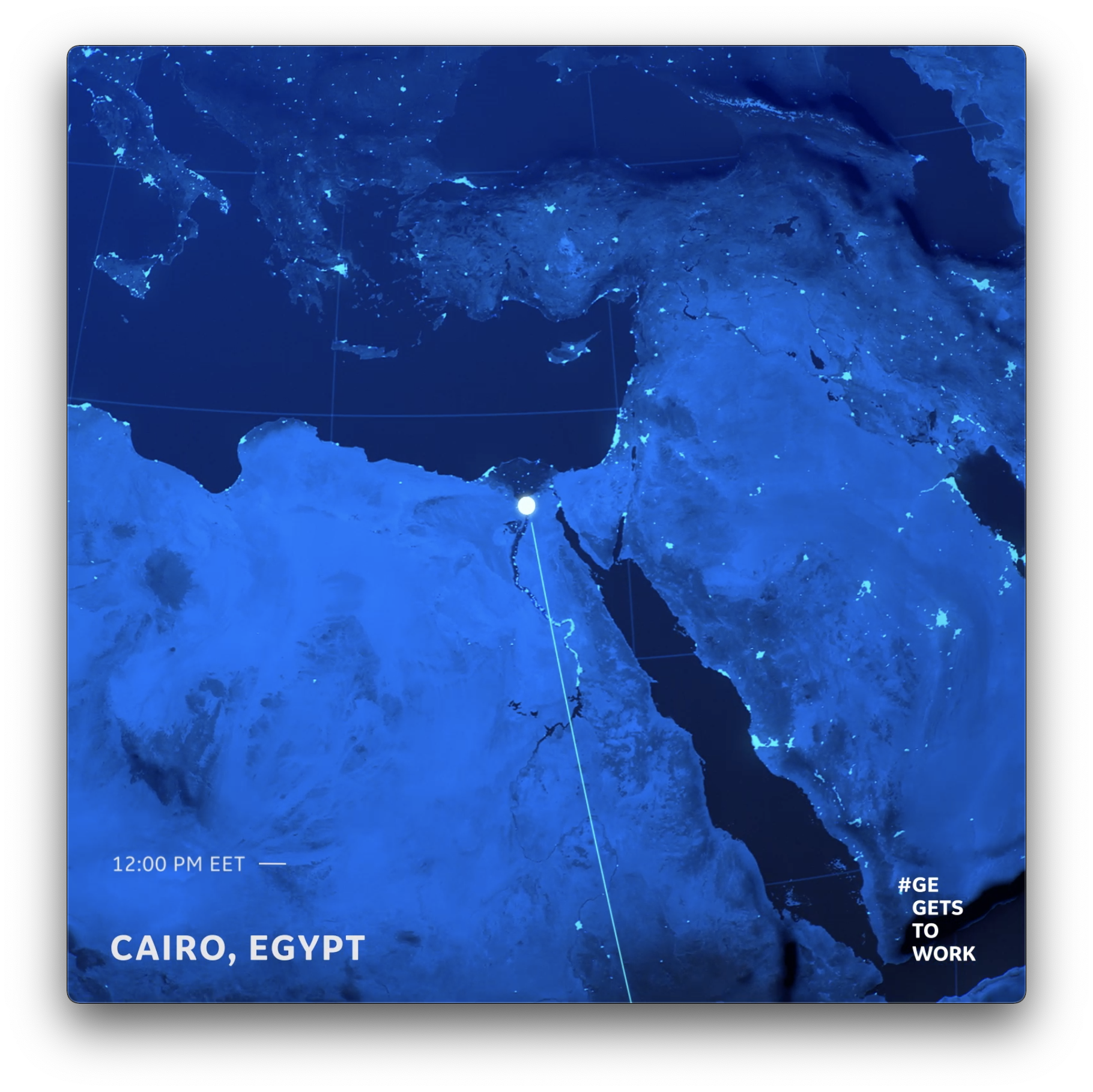 Each timezone required a unique animation that transported the viewer to the location and then off to the next location. I managed the creative visual identity exploration that would inform the graphic treatment developed by our 3rd party vendor that aligned with GE’s brand. In all, we created 24 custom animations that we could then add to the beginning of each video to transport the viewer from one timezone to the next. I facilitated the exploration of what audio and visual cues could compel viewers, who were both watching just one hour or every hour, was no small feat and required us to think strategically from a storytelling, branding, and logistical perspective.